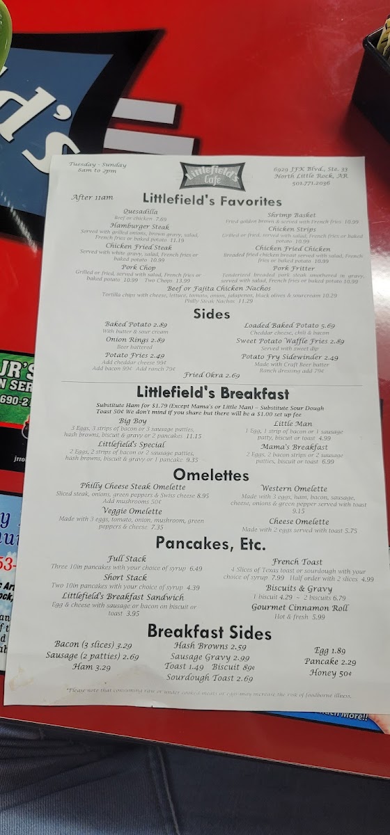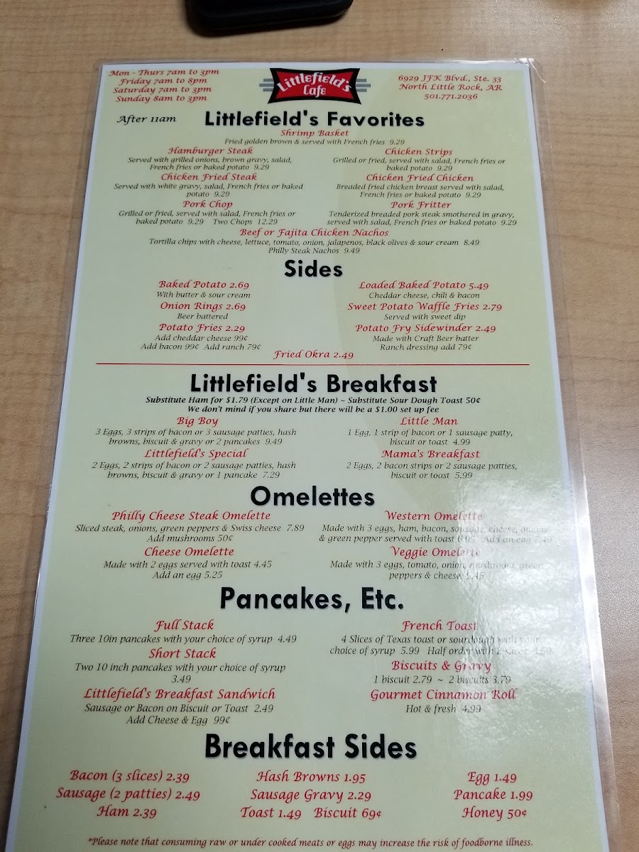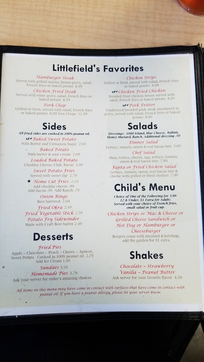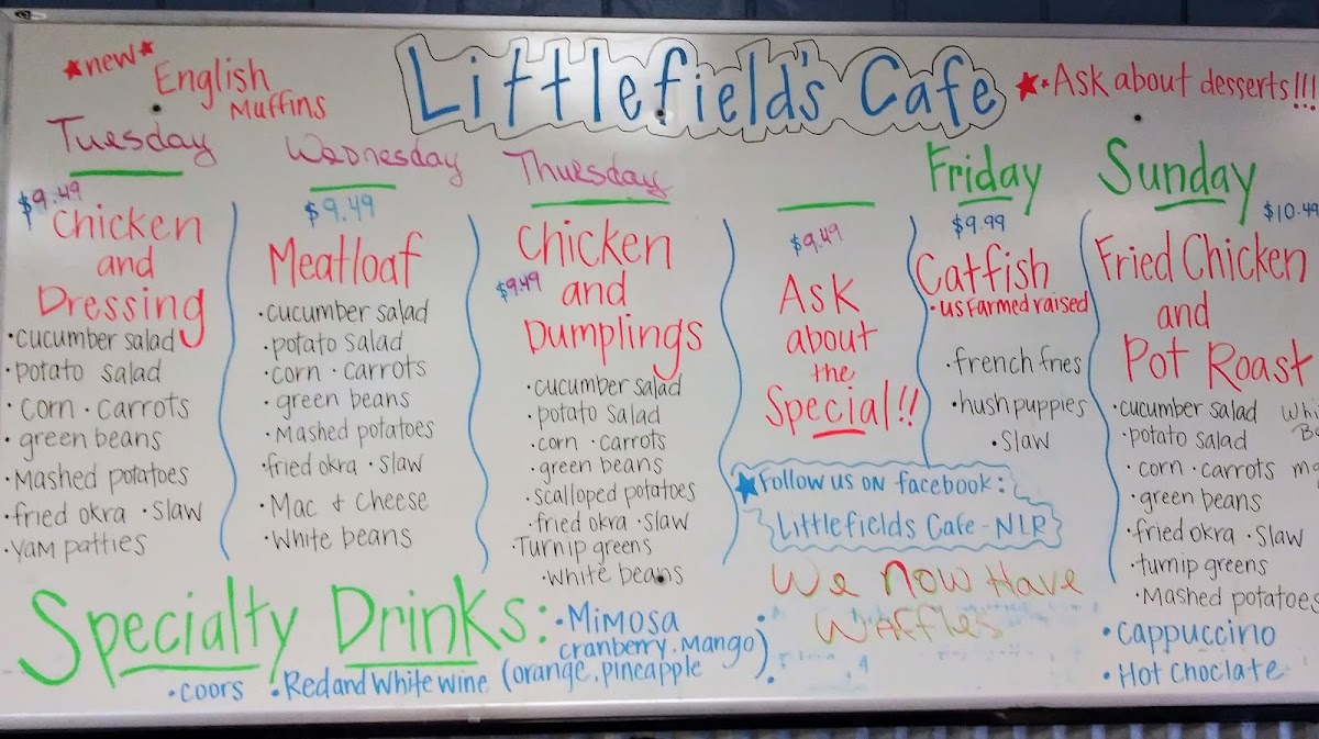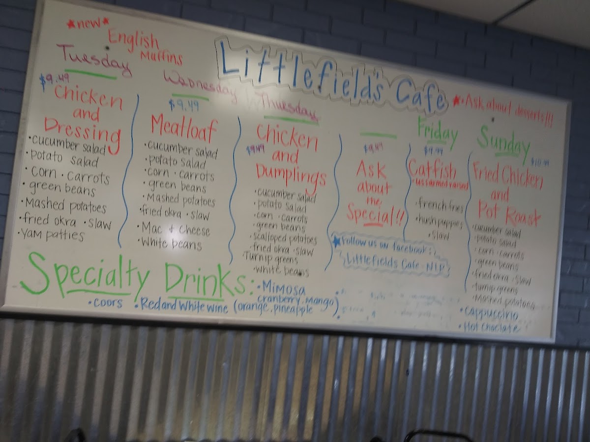 Littlefields Cafe offers a straightforward and comforting menu that focuses on hearty breakfast and lunch favorites. This is the kind of place where you can expect satisfying, familiar dishes served throughout the day, from breakfast staples to classic Southern-inspired lunch options.