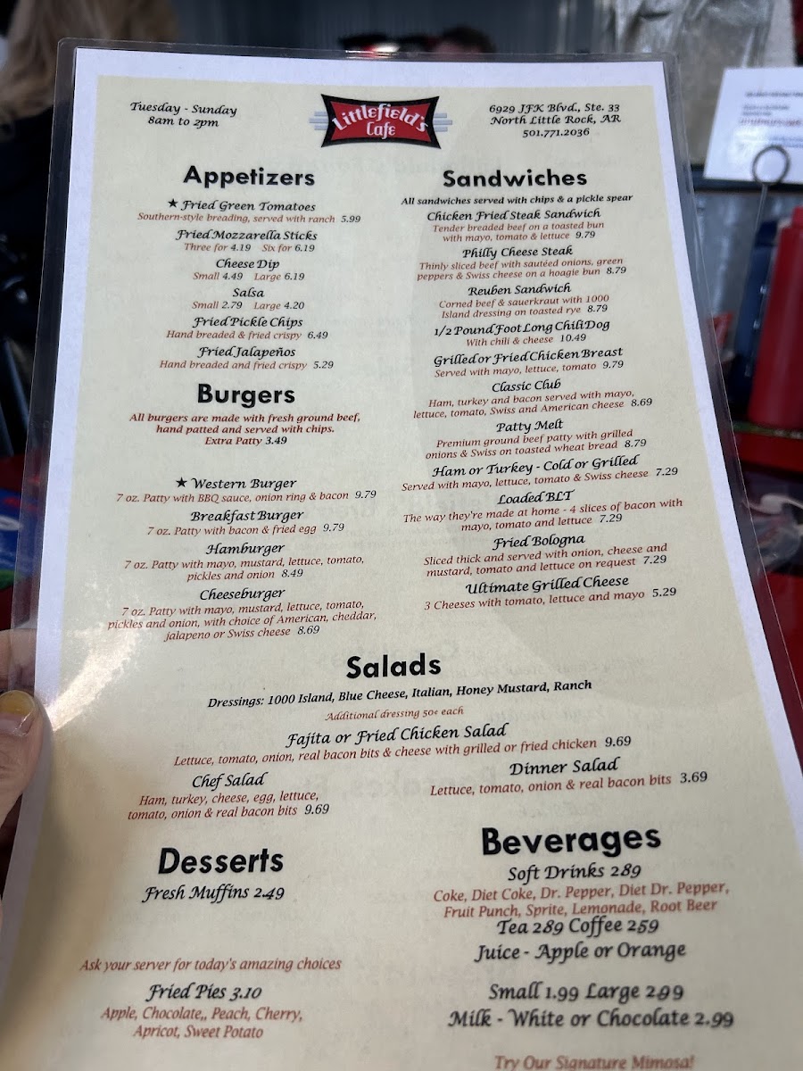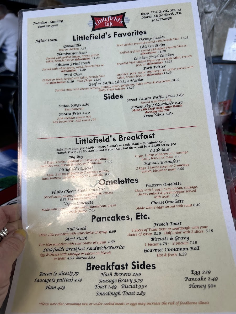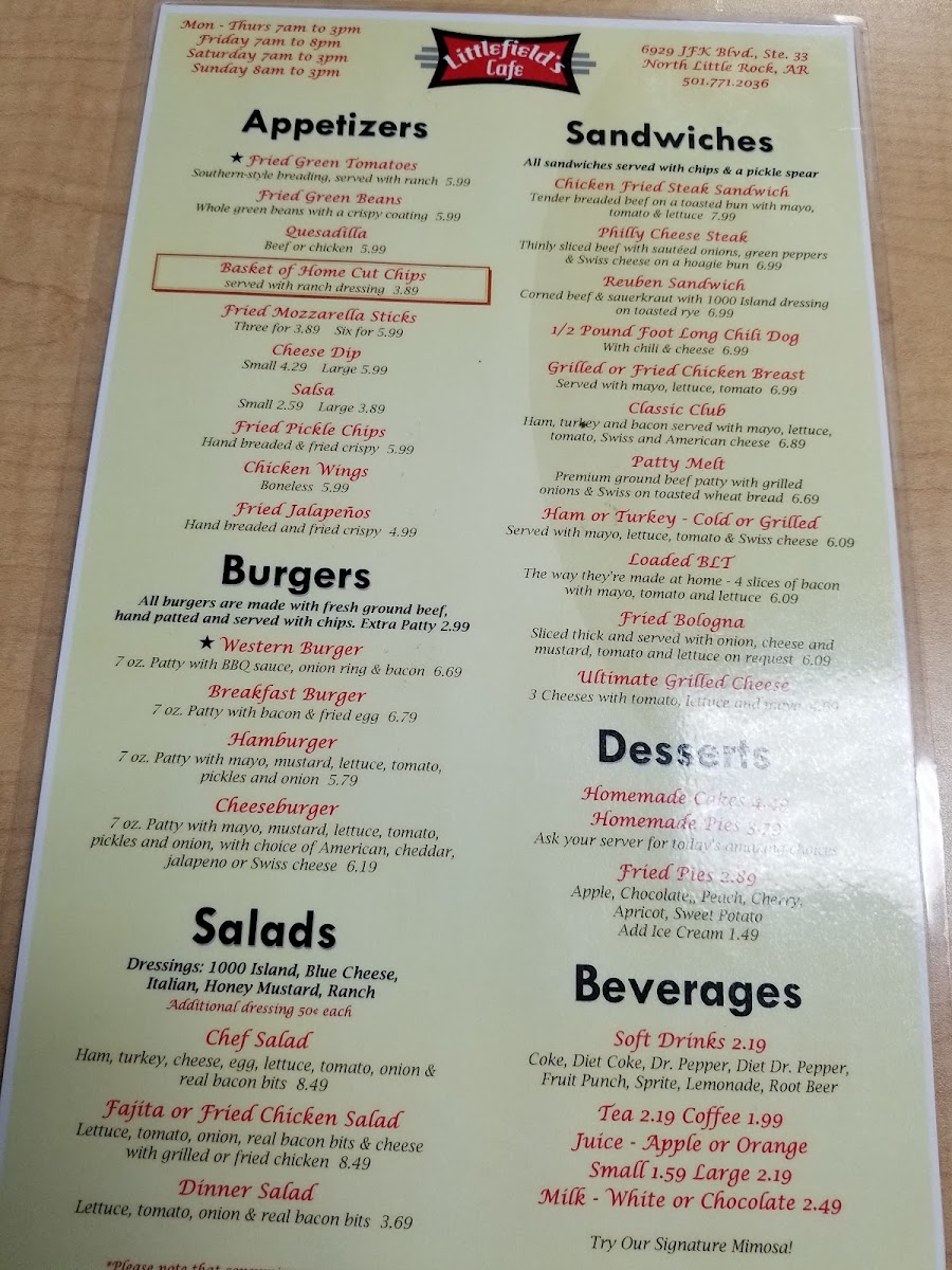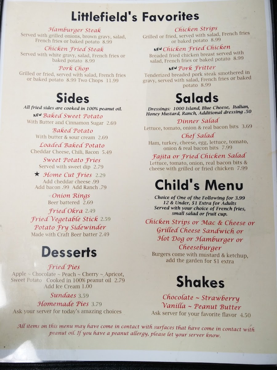 Littlefields Cafe offers a straightforward and comforting menu that focuses on hearty breakfast and lunch favorites. This is the kind of place where you can expect satisfying, familiar dishes served throughout the day, from breakfast staples to classic Southern-inspired lunch options.